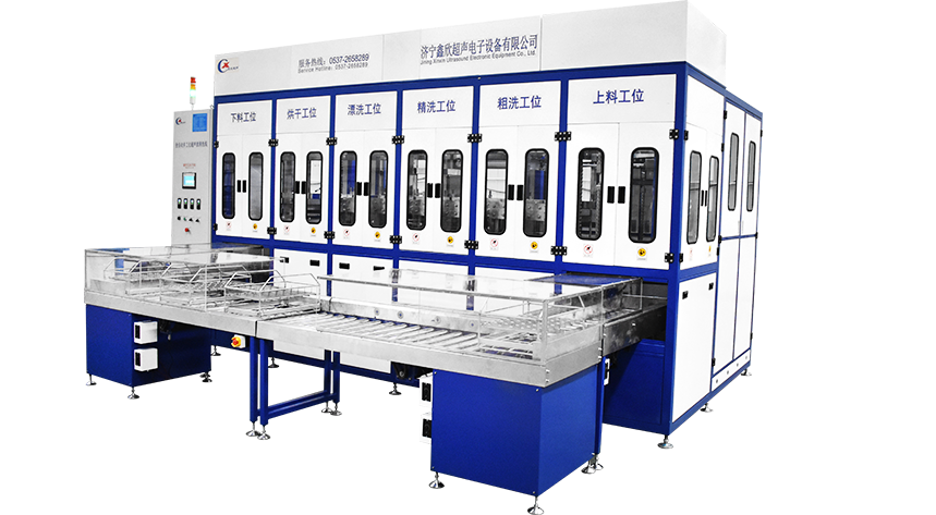該設(shè)備有上下料網(wǎng)帶、超聲波清洗工位、噴淋漂洗工位、高壓風切、熱風烘干工位、溫控水加熱系統(tǒng)、風機、溫控空氣加熱系統(tǒng)、移動式風刀、PLC+觸摸屏控制系統(tǒng)、管路系統(tǒng)及智能電器控制系統(tǒng)等組成。自動進排液和自動